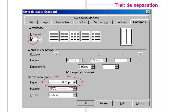- faire deux colonnes (menu Insertion --> Section --> Colonnes ) et ajouter un Trait de séparation